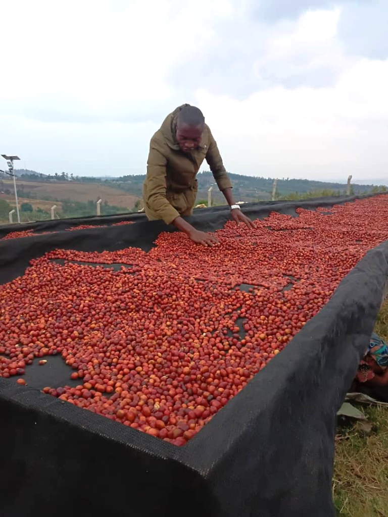 Following his specialized training, Richard started working as a coffee aggregator. He received a start-up kit of essential equipment including a scale, cherry boards, tarpaulins and organic transportation bags and prefinance and began collecting cherries from the community, while also training farmers on the best coffee picking practices.
