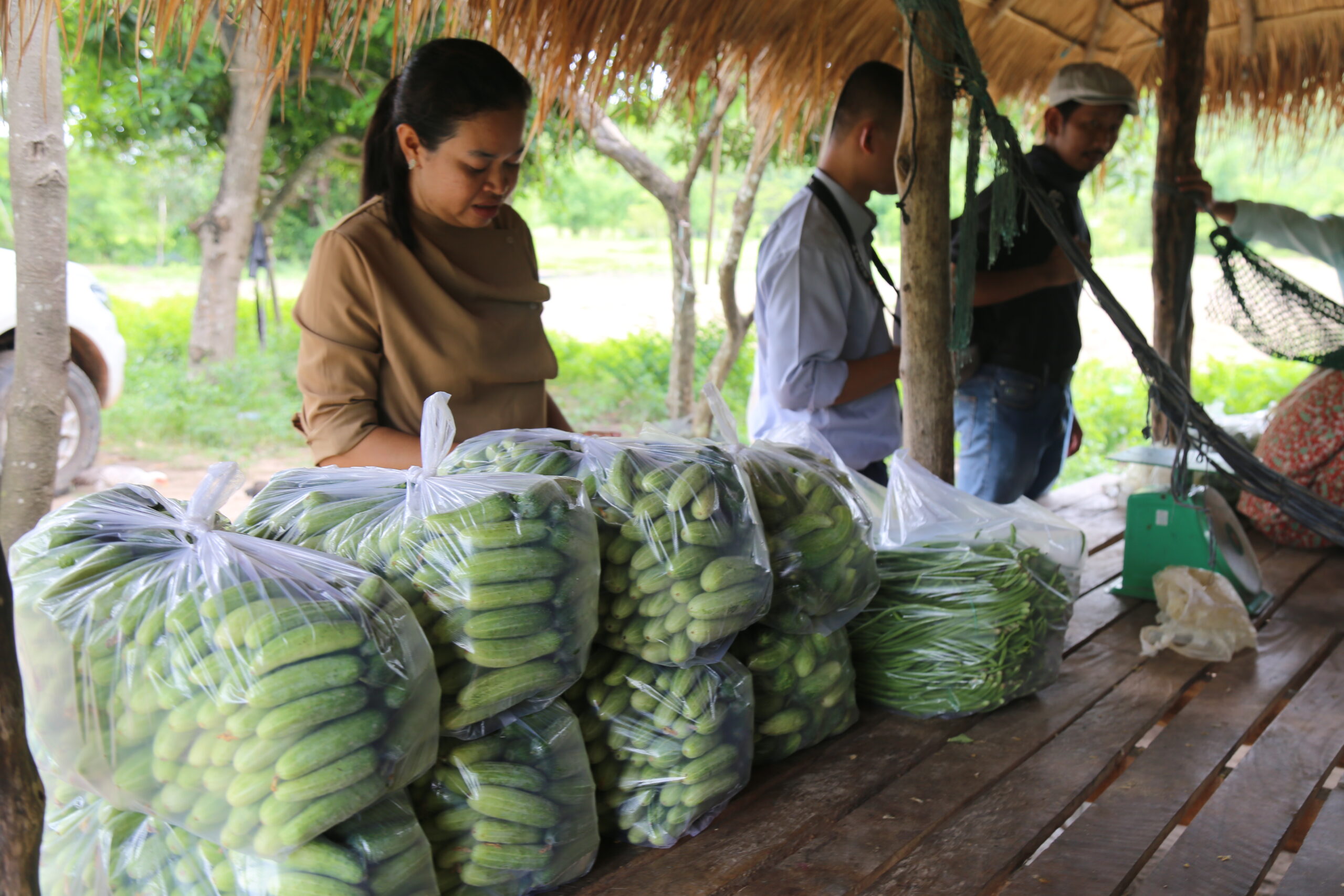 People with bags of cucumbers