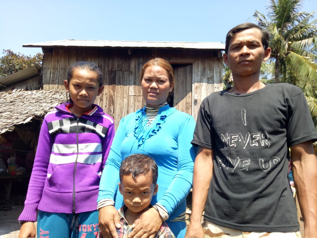 Caption: Kunthea and family in front of their mushroom grow house