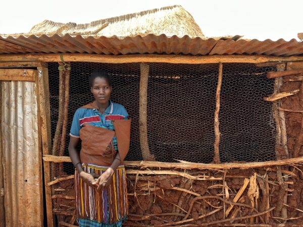 Loema in front of chicken coop